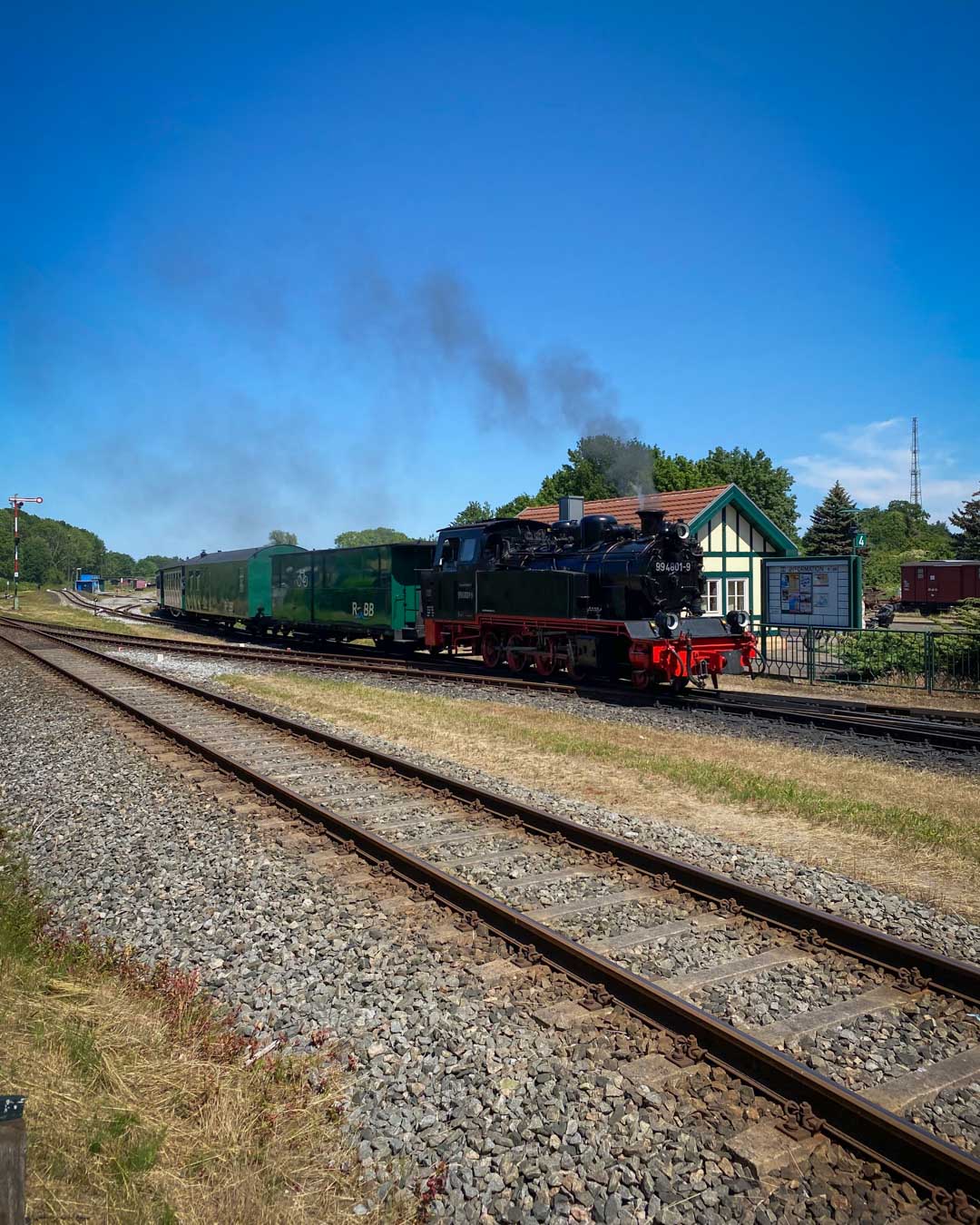 Zum Mittag erreichen wir schließlich Putbus. Während wir uns eine Pizza am Bahnhof gönnen, schauen wir dem rasenden Roland zu. Diese historische Dampflokomotive ist eines der Wahrzeichen der Insel und ihr markantes „TschutTschuuut“ hört man über das gesamte Mönchsgut hinweg.