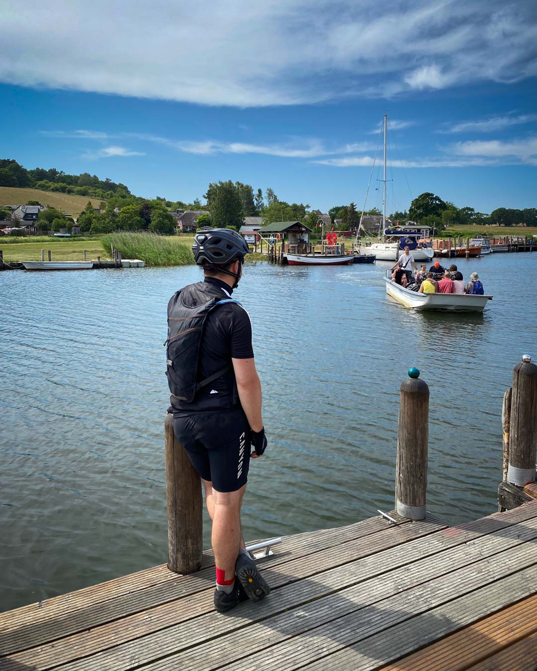Die letzten Meter sind Genussradeln pur. Mit Blick auf das Meer und die Insel Vilm fahren wir auf einem asphaltierten Radweg immer die Küste entlang Richtung Moritzdorf. Hier setzten wir per Ruderboot über. Es ist die kürzeste Fährverbindung Deutschlands. So kurz, dass manche Radler selbst hinüberschwimmen, während der Fährmann die Räder hinterher schippert.