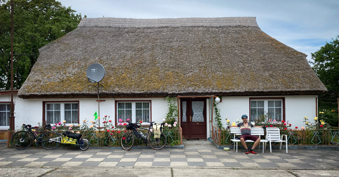So rollen wir die Betonplatten bis zum reedgedeckten Haus von Roberts Großeltern hinunter, stellen die Räder hinterm Haus ab und springen in die Ostsee. Ein paar Tage werden wir uns hier noch erholen, ehe Robert in die Heimat und ich rüber nach Rügen zum Boot meiner Eltern weiterfahre.