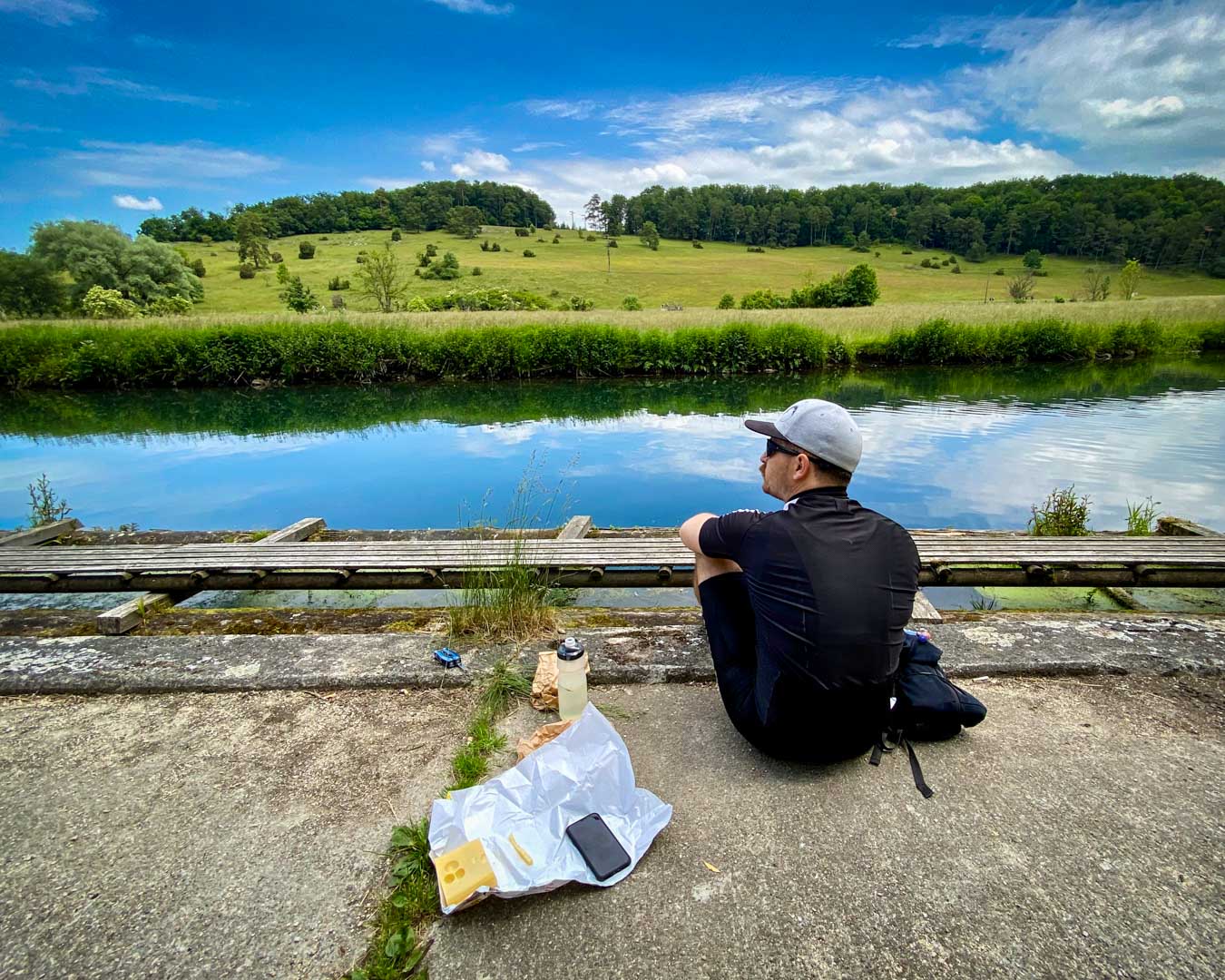 Wie angenommen, gestaltete sich die Tour sehr entspannt. Zunächst ging es durch das beschauliche Lonetal. Entlang von Schotterwegen fuhren wir abseits jeder Straße durch die Wiesen. Mittags gönnten wir uns eine herzhafte Brotzeit am Ufer des kleinen Flusses und schauten den Touristen zu, die in Paddelbooten jeder Form und Größe an uns vorbei trieben.