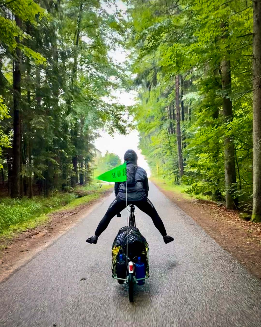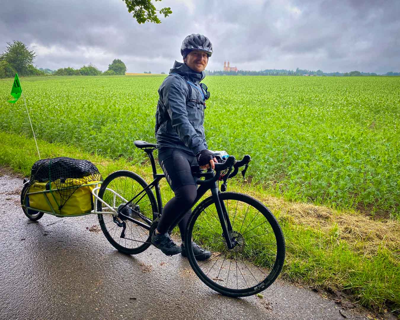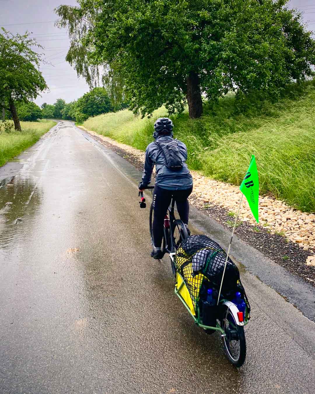 Weil es nun aber mal zu einer Radreise dazu gehört, zogen wir uns die Regenjacken über, verabschiedeten uns von Paul und Tini und strampelten los. Zwar waren unsere Sachen Wasserdicht verpackt und unsere Regenjacken hielten stand, unsere Schuhe waren aber schon nach kurzer Zeit komplett durch. Hinzu kamen auf den schmalen Landstraßen Autos, die uns teilweise gefährlich dicht passierten. So kam das Wasser nicht nur von oben, sondern auch von der Seite und, dank fehlender Schutzbleche, auch von unten.