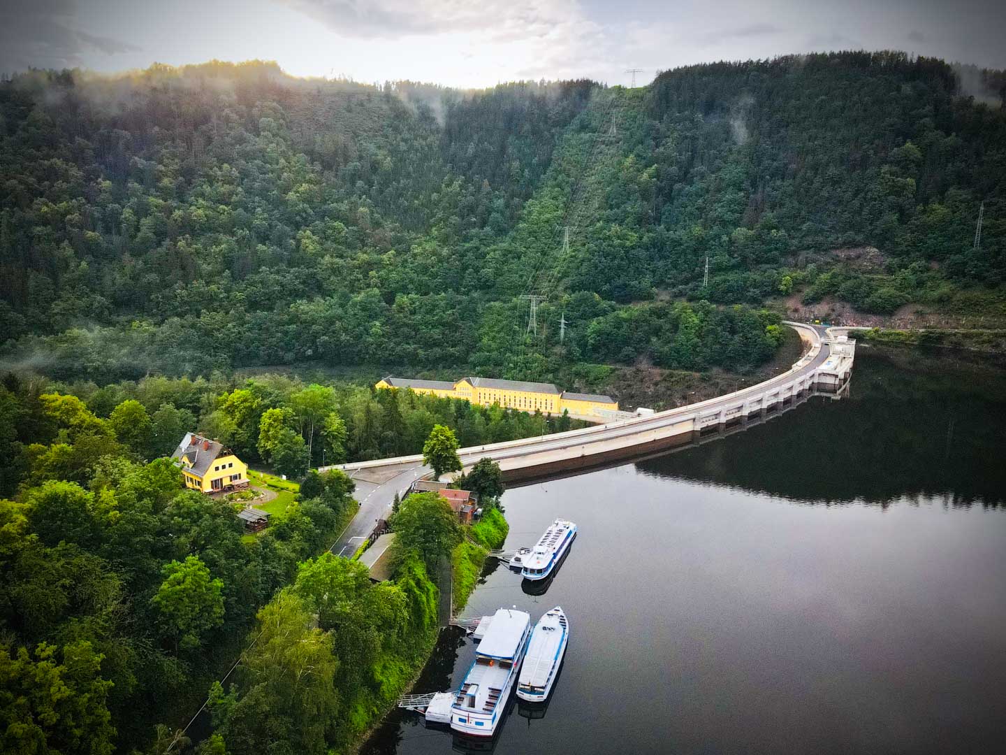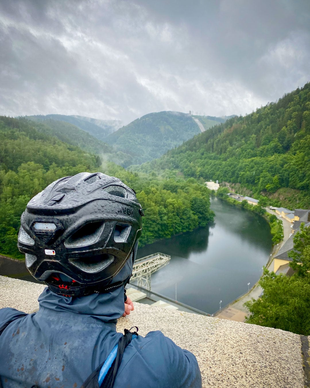 Auch der Regen hatte nachgelassen.Zum Ende hin ging es noch einmal ein wenig bergauf und es eröffnete sich uns ein vertrauter Anblick — der Hohenwartestausee. Tatsächlich hatten wir hier vor einigen Jahren Roberts Jungesellenabschied gefeiert und verbanden somit ein paar amüsante Erinnerungen mit diesem Ort.