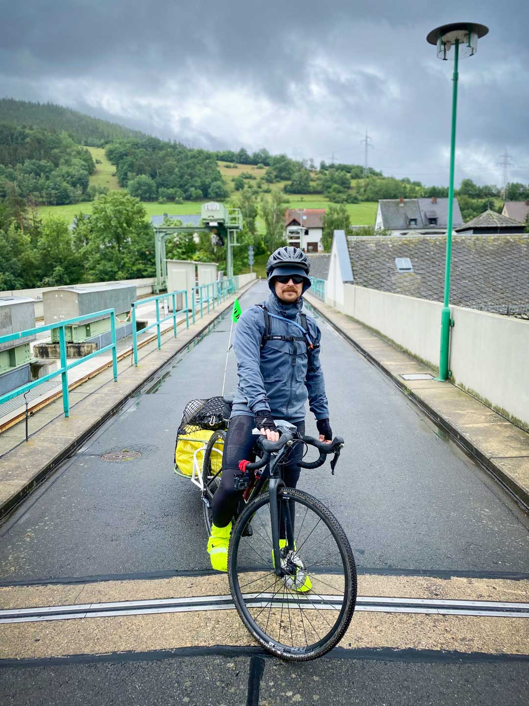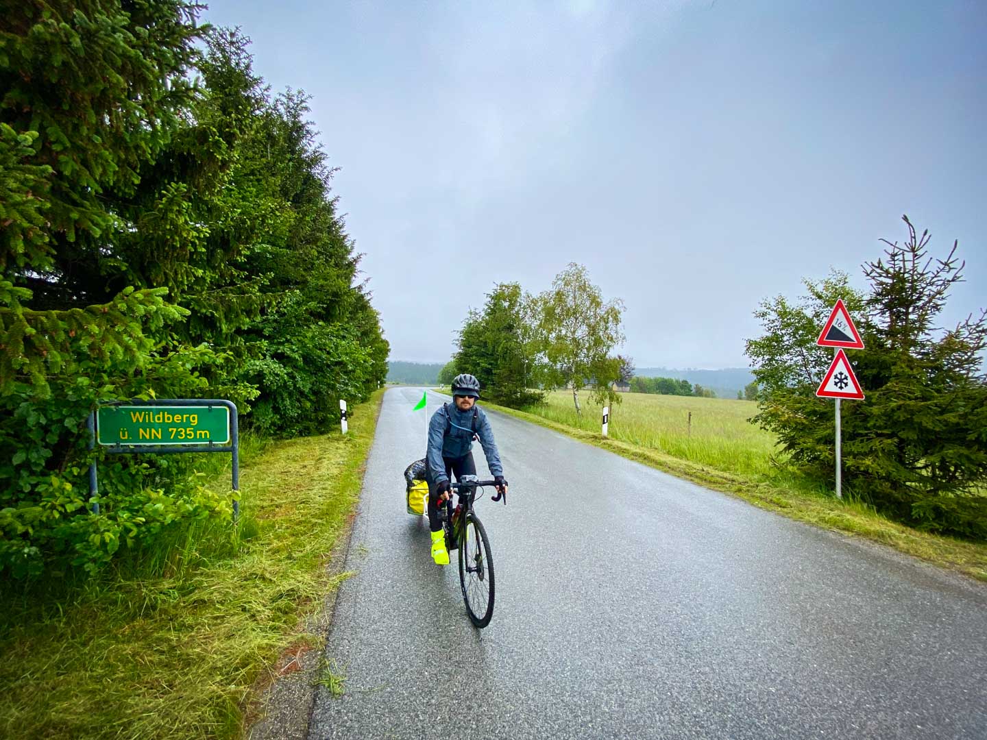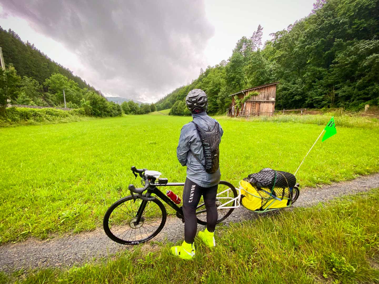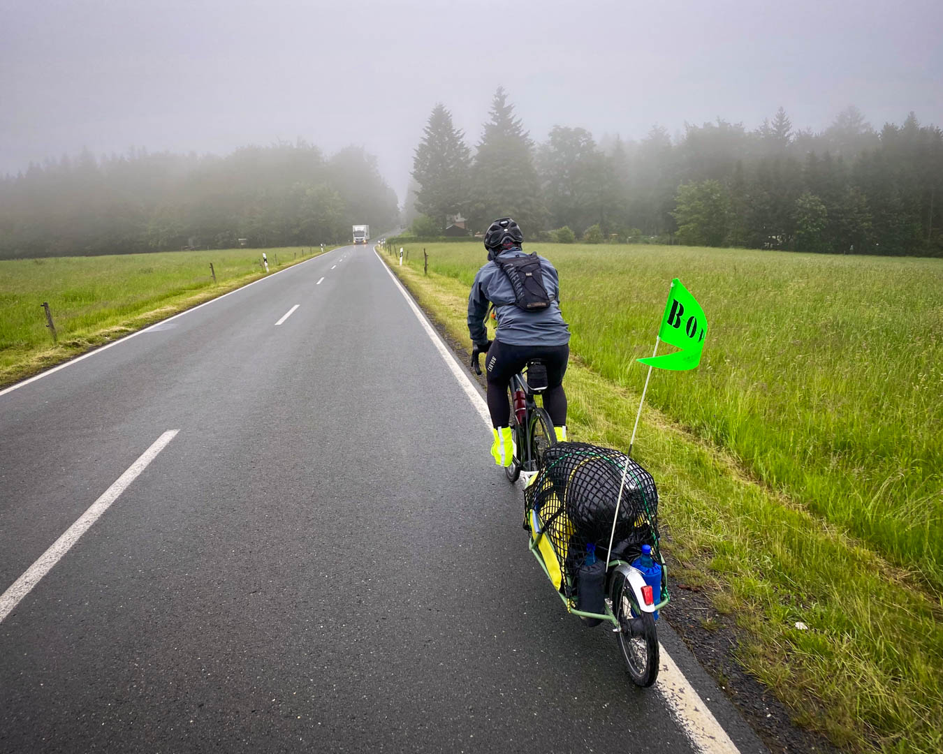 Hier gönnten wir uns erst mal ein deftiges Mittagessen und trockneten so gut es ging unsere klammen Klamotten. Als wir uns anschließend auf die Räder schwangen, ging es zur Belohnung erstmal ein ganzes Stück bergab. Der Regen peitschte uns dabei zwar immer noch ins Gesicht, konnte uns das Grinsen aber nicht nehmen. Kurzzeitig kam ich selbst mit Anhänger über 40 km/h. Ein Glück hatte ich die Bremsen noch erneuert, dachte ich bei mir.