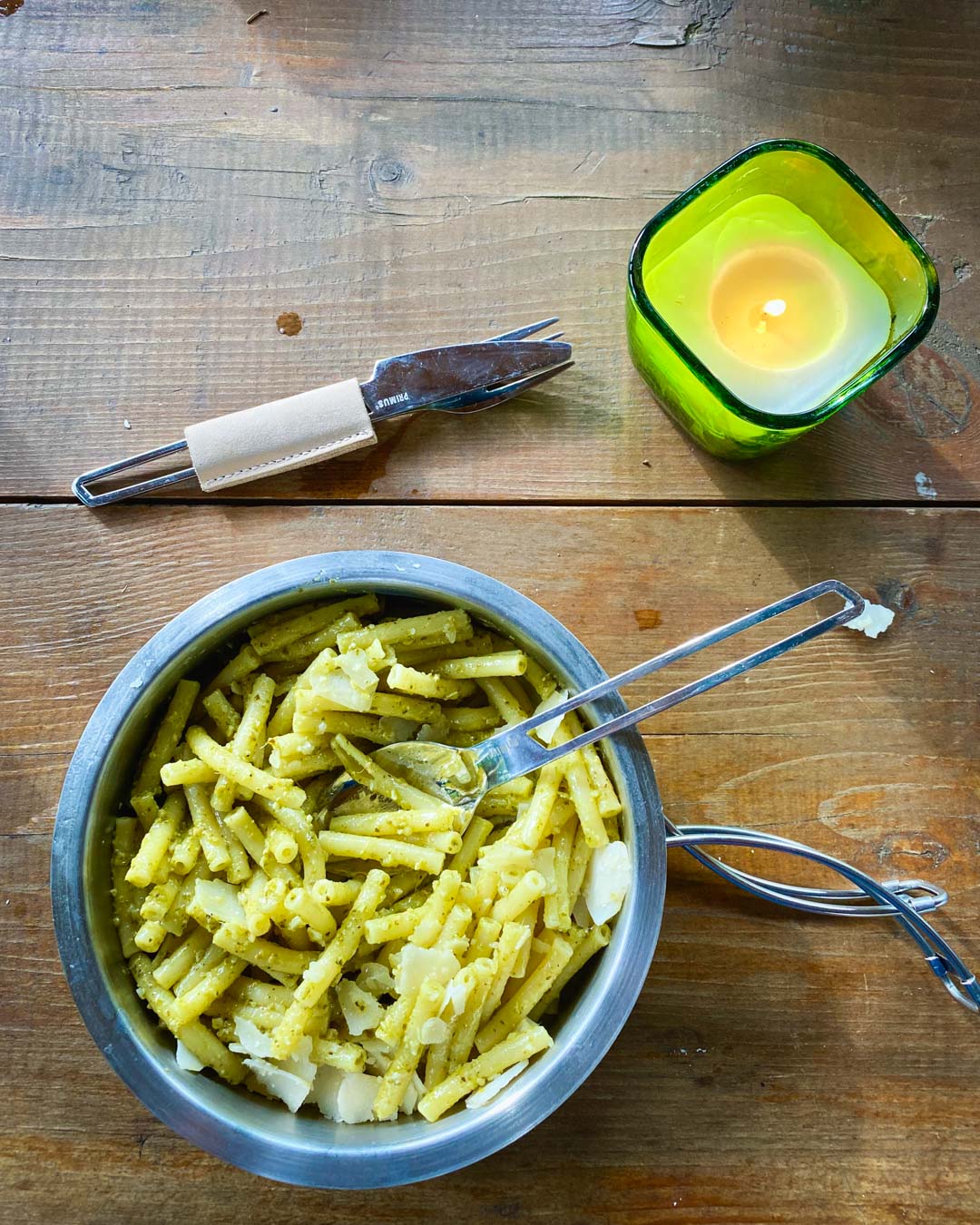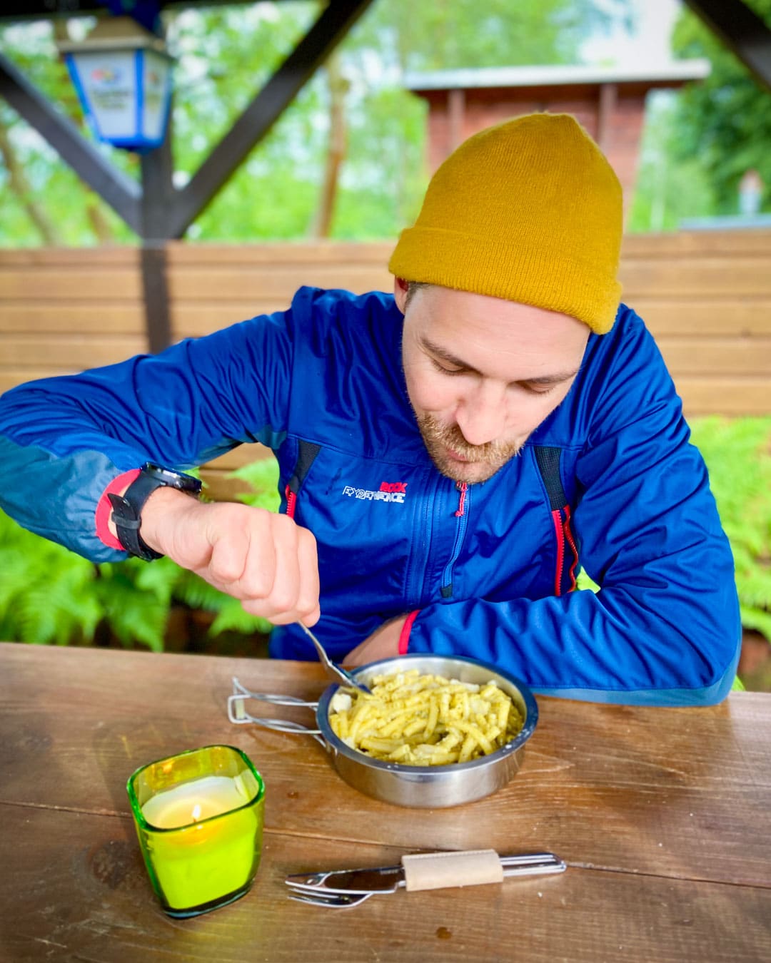 Kurze Zeit später köchelten im Topf die Nudeln. Nach einer großen Portion Pasta mit Pesto rollten wir unter der Bank unserer Schlafsäcke aus und machten es uns gemütlich. Eine Zeitlang hielt uns noch das Scheinwerferlicht vorbeifahrender Autos wach. Doch irgendwann siegte die Müdigkeit und wir schliefen selig ein.