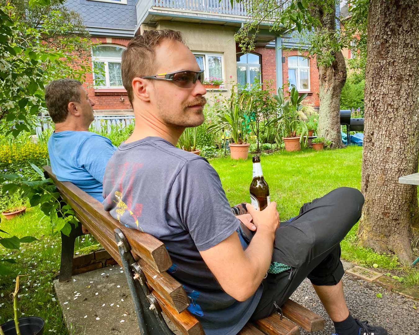 Ansonsten verstrich der Tag recht unspektakulär. Bei einem oder auch zwei gemütlichen Bieren ließen wir uns im Garten unserer Gastgeber die Sonne auf den Bauch scheinen. Bernd drehte mit uns dann noch eine Runde durch Sonneberg. Die Spielzeugstadt mit ihren schiefergedeckten Backsteinhäusern hat schon ihren ganz eigenen Reiz. Außerdem hatte man von den nahegelegenen Bergen einen wunderbaren Blick über das Frankenland. So konnten wir ein wenig Revue passieren lassen, wie weit wir eigentlich schon gekommen waren.
