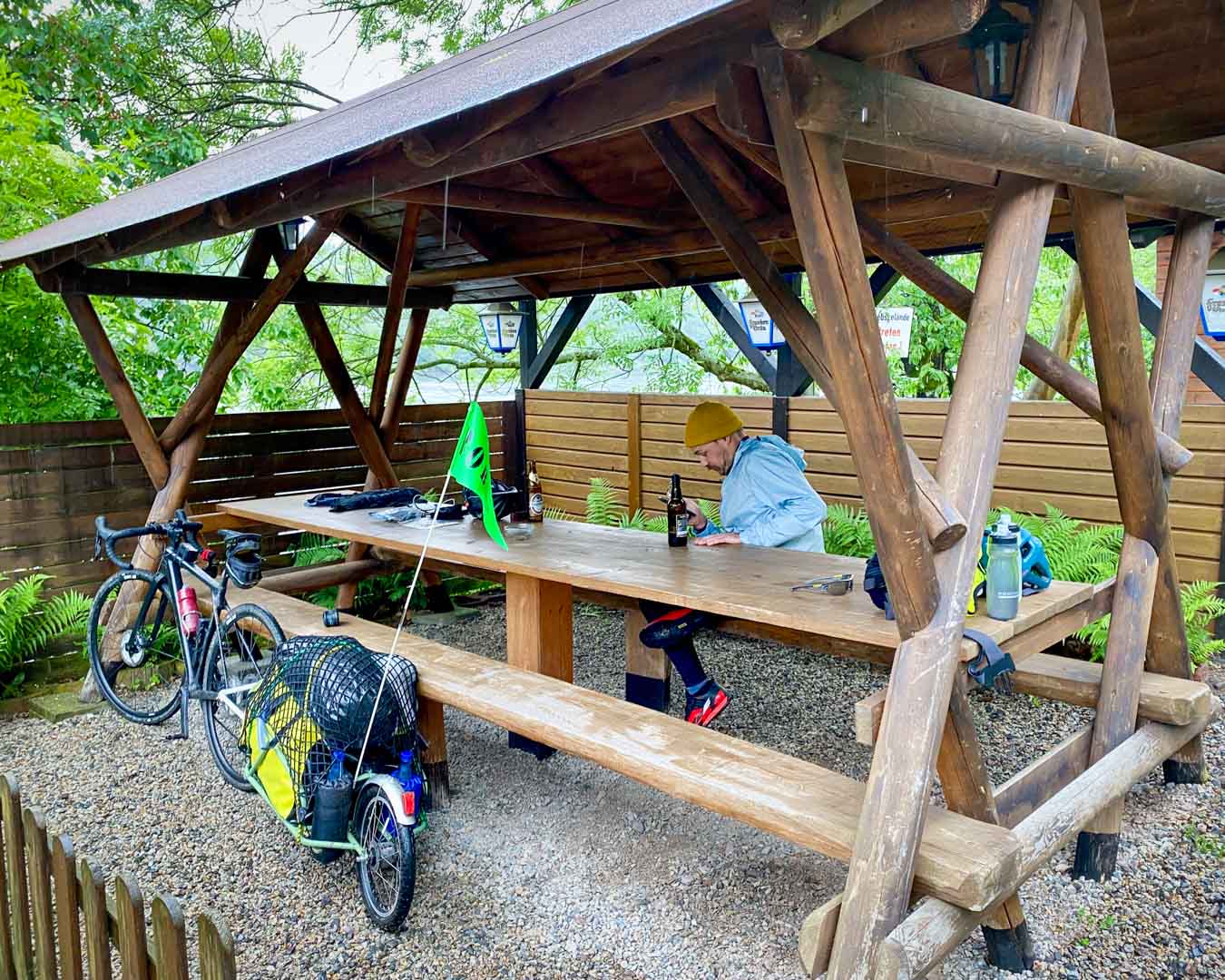 Bei Kaffee und Kuchen ließen wir unseren Blick über die Staumauer schweifen und überlegten, wo wir heute Abend die Schlafsäcke ausrollen sollten. Da setzte, dankenswerter Weise, der Regen wieder ein und zwar nicht zu knapp. Der Wirt wollte gerade schließen und wir fragten, ob wir noch bleiben durften, bis der Regen weniger würde. Daraufhin meinte er, wir könnten seinetwegen am überdachten Rastplatz hinter der Kneipe die ganze Nacht verbringen. Das ließen wir uns nicht zweimal sagen.